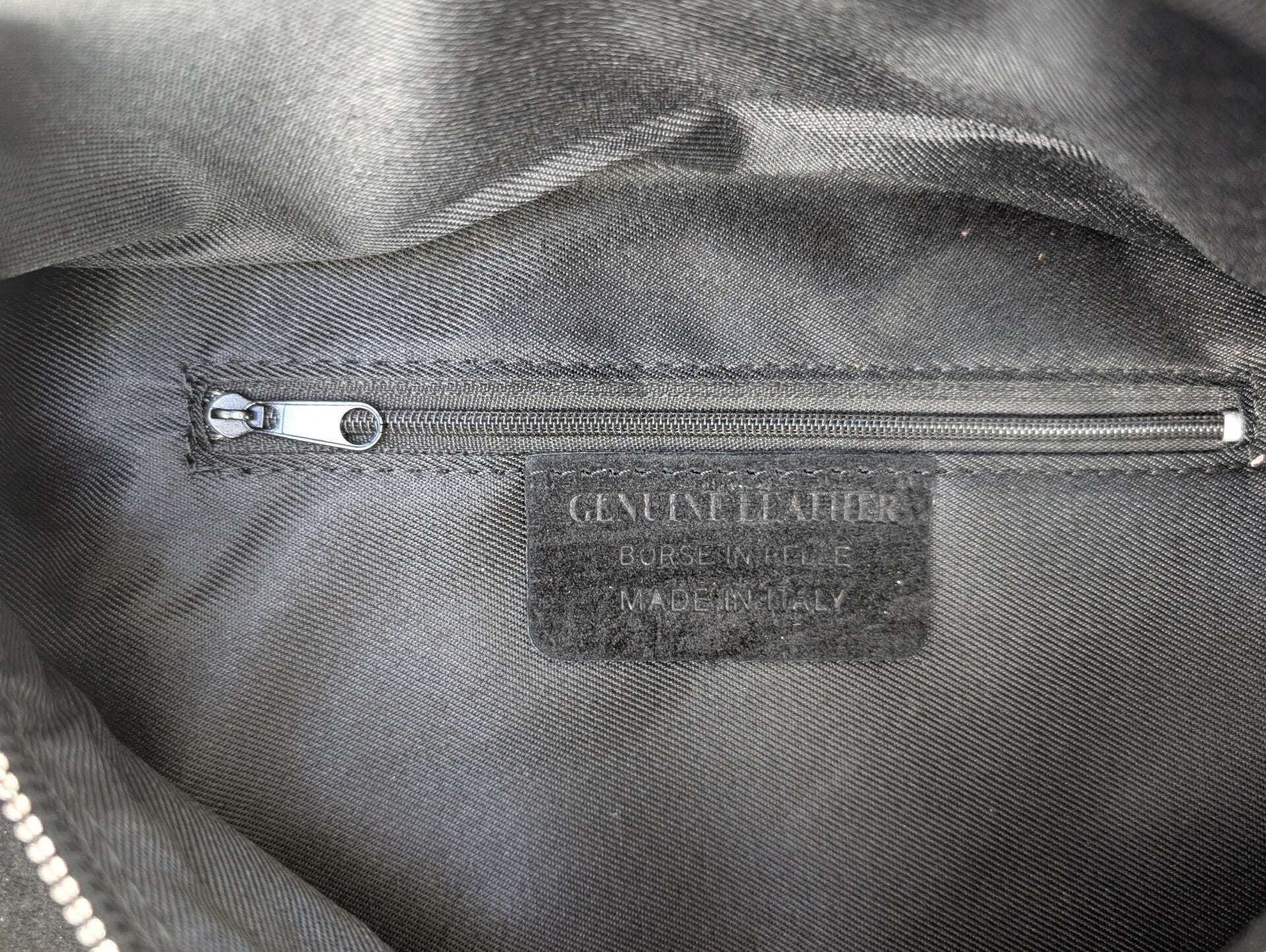 Die Tasche hat einen silberfarbenen Reißverschluss vorne sowie hinten und eine Innentasche mit Reißverschluss.