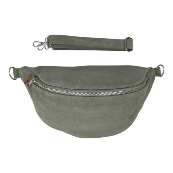 Bauchtasche Wildleder Salbeigrün silberfarbener Reißverschluss