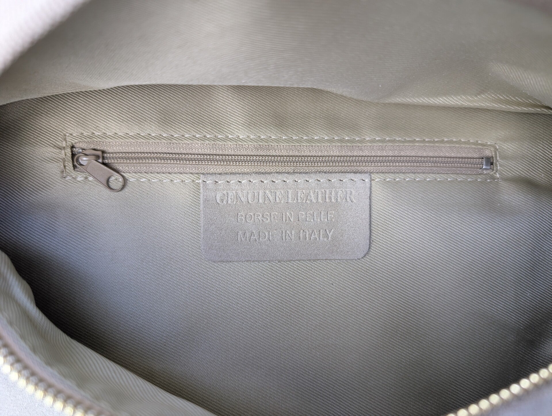 Die Tasche hat einen goldfarbenen Reißverschluss vorne sowie hinten und eine Innentasche mit Reißverschluss.